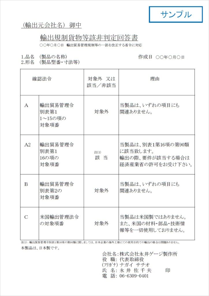 - 非該当証明書の発行には、輸出元の会社の正式名称と製品の品番をお知らせください。